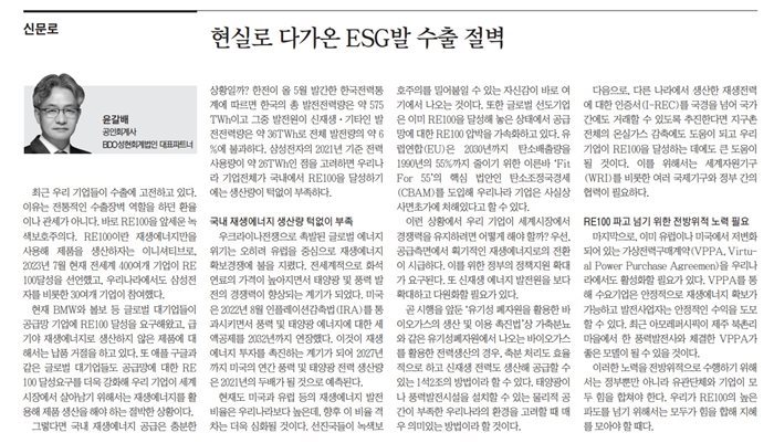 이러한 노력을 전방위적으로 수행하기 위해서는 정부뿐만 아니라 유관단체와 기업이 모두 힘을 합쳐야 한다. 우리가 RE100의 높은 파도를 넘기 위해서는 모두가 힘을 합해 지혜를 모아야 할 때다.